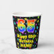 This cheerful and exciting birthday-themed paper cup design features a large number “65” with a rainbow spectrum gradient inspired pattern, along with the message “Happy 65th Birthday,”, and a custom name. The background features a colourful pattern featuring many star shapes with different colours and sizes. Colourful, vibrant paper cups like this might be fun to have at a birthday party/celebration being held in celebration of somebody’s 65th birthday. [~Z0000540]