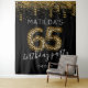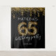 Fun 65th birthday party photo booth backdrop featuring a trendy black background, gold glitter and confetti, 65 leopard print hellium balloons, the birthday girl/boys name, and date.
