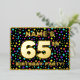 The front of this joyful sixty-fifth birthday celebration/party foil invitation card design features a customisable name, a large number “65th”, the message “BIRTHDAY PARTY!”, and a border. The background of the front has an exciting, multicolored star shapes pattern. The back features personalised details about the event, such as the date, time, place/venue, and any other information that may be relevant. Customisable invitations like these might be a fun way to invite guests/attendees to a birthday gathering/party being held to celebrate somebody’s 65th birthday. [~Z0000600]