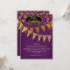 Celebrate a 65th Birthday Party with glitz and glamour! Sleek. Modern. Chic. Understated glam - with glittering pennant banners in two shades of golden glitter with sparkling twinkling falling confetti in various sizes and shade of gold. Sparkly starburst shining stars highlight the sparkle. A very contemporary typography text layout that is anything but traditional. It is simple and short. It says to your guests, "We're throwing a party and it will be the party of a lifetime!" For the elegant but non-traditional bride and groom. COLORS: deep dark violet eggplant purple and gold, golden glitters. Especially suited for fall or winter weddings, New Year's Eve Parties, Birthday parties and Anniversary party announcements.