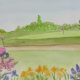 This charming watercolor features a pine-lined golf course and a playful pink golf cart, framed by soft pink astilbe and blooming Russian sage—creating a lighthearted, serene setting perfect for a 65th birthday celebration.