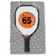 Happy 65th Birthday text on orange pickleball and paddle on polka dot grey and white pattern.