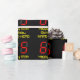 This silly and nerdy birthday-themed wrapping paper design features a large number "65" having a red seven segment digital display style appearance, along with the message "Happy 65th Birthday," and a personalised name in nerdy retro style yellow text, on a black coloured background. Wrapping paper like this might be used when giving a gift or present in honour of somebody’s 65th birthday. [~Z0000387]