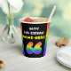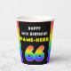 This bold and fun birthday themed paper cup design features a large number “66“ with a vibrant multicolored rainbow spectrum inspired gradient pattern, along with the message “HAPPY 66th BIRTHDAY,”, and an editable recipient name. Paper cups like this might be used at a party for somebody who is celebrating their sixty sixth birthday. [~Z0000639]