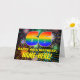 The front of this joyful and upbeat birthday themed greeting card design features a large number “66” with a multicolored rainbow spectrum inspired gradient pattern, along with the message “HAPPY 66th BIRTHDAY,”, and a custom recipient name. The background of the front features a fun, colourful, bursting celebratory fireworks-inspired pattern. The inside features a customised birthday greeting message, or could perhaps be cleared and left blank if a message is to be written by hand instead. A colourful, customised birthday greeting card like this might be used to celebrate somebody’s sixty-sixth birthday. [~Z0000619]