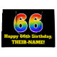 This fun and vibrant birthday-themed gift bag design features a large number "66" with a rainbow spectrum gradient inspired pattern, along with the message "Happy 66th Birthday,", and a custom name. It also has a black-coloured background. A colourful birthday themed gift bag like this might be a fun way to wrap a gift or present being given to somebody who is celebrating their sixty sixth birthday. [~Z0000521]