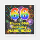 This fun and exciting birthday paper napkin design features a large number “66” having a colourful rainbow spectrum gradient inspired pattern. It also features the message “Happy 66th Birthday,”, and a personalised name. The background features an exciting and colourful pattern inspired by the look of bursting celebratory fireworks. Colourful birthday themed paper napkins like this might be used at a party in celebration of somebody’s 66th birthday. [~Z0000574]