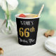 This elegant and ornate birthday paper cup design features a custom name and the message “66th Birthday Party”. The large number “66th” has a faux/imitation gold-inspired colouring pattern, and the words “Birthday Party” are in opulent script-style text. The background is coloured black by default (although it can be customised). Luxurious, fancy paper cups like this might be used at a birthday party/celebration being held in celebration of somebody’s sixty sixth birthday. [~Z0000567]