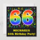 The front of this fun, exciting, and vibrant birthday party invitation design features a large number "66" with a rainbow spectrum gradient inspired pattern, along with a custom name and the message "66th Birthday Party!" Part of the background features a fun pattern of various music notes and symbols having a variety of colours and sizes. The back features personalised details/information regarding the event that the potential guests are being invited to. Vibrant, customised birthday party invitation cards like this might be sent to potential guests of a gathering being held to celebrate a musician’s, a song composer’s, a singer’s, or somebody else’s sixty sixth birthday. [~Z0000427]