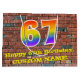 This fun and colourful birthday-themed giftbag design, inspired by urban art, features a large number "67" having a rainbow spectrum gradient inspired pattern. It also features the message "Happy 67th Birthday,", and a customisable name. The background features a brick wall inspired pattern. A giftbag like this might be used when giving a gift or present in honour of somebody’s 67th birthday. [~Z0000522]
