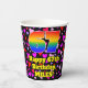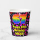 This happy and cheerful birthday-themed paper cup design features a large number “67” having a rainbow spectrum gradient inspired pattern. It also features the message “Happy 67th Birthday,”, and a customisable name. The background features a pattern of purple, pink, and red heart shapes. Loving, joyful paper cups like this might be fun to have at a birthday celebration/party being held in celebration of somebody’s sixty seventh birthday. [~Z0000548]