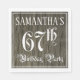 This fancy and elaborate birthday-themed paper napkin design features a personalised name and the message “67th Birthday Party”. The large number “67th” and the words “Birthday Party” are in ornate script-style text. The background features an imitation/faux woodgrain-inspired pattern. Luxurious, ornate paper napkins like this might be useful at a birthday celebration/party being held to celebrate somebody’s sixty seventh birthday. [~Z0000564]