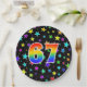 This fun, colourful, and cheerful paper plate design features a large number "67" containing a rainbow spectrum gradient inspired pattern colouring. The background features a colourful pattern of star shapes. Fun paper plates like this might be used at somebody’s 67th birthday celebration, or a couple’s 67th wedding anniversary party, or some other sixty seventh event. [~Z0000493]