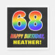 This cheerful, fun, and colourful birthday-themed paper napkin design features a large number "68" and the message "HAPPY BIRTHDAY,", both coloured with a rainbow spectrum gradient inspired pattern, along with a bold yellow customisable recipient name. The background is coloured black. Fun, customised paper napkins like this might be used at a birthday party being held to celebrate somebody’s sixty-eighth birthday. [~Z0000476]