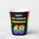 This fun and upbeat birthday themed paper cup design features the number “68“ having a multicolored rainbow spectrum inspired gradient pattern, along with the message “HAPPY 68th BIRTHDAY,”, and a personalised recipient name. Cheerful paper cups like this might be fun to use at a birthday party in honour of somebody’s 68th birthday. [~Z0000639]