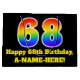 This colourful and vibrant birthday-themed gift-bag design features a large number "68" with a rainbow spectrum gradient inspired pattern, along with the message "Happy 68th Birthday,", and an editable name. It also has a black-coloured background. A fun birthday themed gift bag like this might be a fun way to wrap a gift or present being given to somebody who is celebrating their 68th birthday. [~Z0000521]