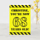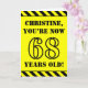 The front of this attention-grabbing and bold birthday-themed greeting card design features a custom name and the message "YOU’RE NOW 68 YEARS OLD!" in black stencil look text on a yellow coloured background. There is also an eye-catching black and yellow striped pattern at the top and bottom edges of the front. The inside features a custom birthday greeting message, or could perhaps be cleared and left blank if a message is to be written by hand instead. A personalised birthday card like this might be a fun way to acknowledge somebody’s sixty eighth birthday. [~Z0000413]