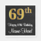 This luxurious, sophisticated, and elegant birthday themed paper napkin design features a large ordinal number “69th” having a faux/imitation gold-like gradient pattern, in addition to the birthday greeting message “Happy 69th Birthday,” and a custom name in a script-style font. The background is coloured black. Paper napkins like this might be used when celebrating somebody’s sixty ninth birthday. [~Z0000516]