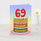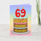 This fun and colourful birthday-themed greeting card design features a cartoon-style depiction of a three-tier birthday cake having numeral-shaped candles on top showing the number “69“, along with the message “HAPPY 69TH BIRTHDAY,”, and a custom recipient name. The background of the front has a multicolored pastel rainbow spectrum inspired gradient pattern. The inside has a personalised birthday greeting message, or could perhaps be cleared and left blank if a message is to be written by hand instead. A joyful, customisable birthday greeting card like this might be a fun way to deliver birthday greetings to somebody who is celebrating their sixty-ninth birthday. [~Z0000625]