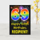 The front of this fun, exciting, and colourful birthday themed greeting card design features a large number "69" having a rainbow spectrum gradient inspired pattern. It also features the message "Happy 69th Birthday,", and a personalised recipient name. The front additionally features a colourful bursting celebratory fireworks inspired background pattern. The inside features a customisable birthday greeting message, or could perhaps be cleared and left blank if a message is to be written by hand instead. A personalised birthday card like this might be a fun way to send a message celebrating somebody’s sixty ninth birthday. [~Z0000442]