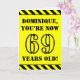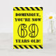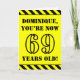 The front of this fun and bold birthday themed greeting card design features an editable name and the message "YOU’RE NOW 69 YEARS OLD!" in black stencil look text on a yellow colored background. The front also features an eye-catching black and yellow striped pattern at the top and bottom edges. The inside features a customizable birthday greeting message, or could perhaps be cleared and left blank if a message is to be written by hand instead. A birthday card like this might be a fun way to send birthday wishes to somebody who is celebrating their sixty ninth birthday. [~Z0000413]