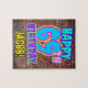 This fun birthday puzzle design features the message “HAPPY 69TH BIRTHDAY,” having a vibrant, colourful, urban street art and graffiti inspired appearance, in addition to a custom recipient name. The background features a pattern inspired by the look of a brick wall. A fun, customisable birthday puzzle like this might be given to celebrate somebody’s sixty-ninth birthday. [~Z0000532]