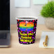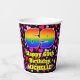 This fun and cheerful birthday themed paper cup design features a large number “69” having a rainbow spectrum gradient inspired pattern. It also features the message “Happy 69th Birthday,”, and a personalised name. The background features a pattern of purple, pink, and red heart shapes. Cheerful, upbeat paper cups like this might be fun to have at a birthday celebration being held to celebrate somebody’s sixty ninth birthday. [~Z0000548]