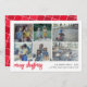 A collage of 6 photos in a simple grid to highlight many pics from the past year. The photo grid includes 4 square photos and 2 horizontal photos. A modern look for a holiday photo card with red coloured accents and "merry christmas" in a large, trendy script font. The background is white.