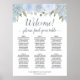 This beautiful hand-painted watercolor wedding seating chart is designed to accommodate 60 guests at 6 tables, each with 10 seats. The design features dusty blue coloured roses, blossoms and flowers, complemented by rustic boho chic accents of sage green foliage, eucalyptus leaves, and greenery. The title "Welcome! Please find your table" is written in elegant script calligraphy, adding a touch of elegance to the overall design. The names of the couple and wedding date are also included at the bottom of the chart, making it an easy way to welcome guests and help them find their seats.