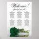 This beautiful wedding seating chart has six tables, each accommodating 10 guests, totalling 60 guests. The chart features a romantic design, showcasing a single long-stemmed deep emerald green coloured rose delicately resting on its side and reflecting in a serene pool of water. The chart's title, rendered in elegant script calligraphy, warmly invites guests with "Welcome! Please find your table," while leaving sufficient space at the bottom for the couple's names and wedding date. This seating chart serves as a wonderful and practical way to greet your guests and assist them in finding their designated seats at the reception, exuding an air of charm and sophistication.