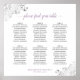 This 6 table seating chart is both simple and elegant with dark grey and light purple or lavender text on a white background and lacy silver faux foil floral filigree in the corners. The title reads "please find your table" in an elegant script calligraphy. Sophisticated and chic. Includes table assignments for 60 guests with 10 seats per table.