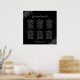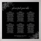 This 6 table seating chart is both simple and elegant with grey text on a black background and lacy silver faux foil floral filigree in the corners. The title reads "please find your table" in an elegant script calligraphy. Sophisticated and chic. Includes table assignments for 60 guests with 10 seats per table.