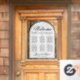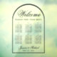 A simple transparent wedding seating chart inside a modern arch frame. The text and the frame are black. The Welcome and the names are written in an elegant calligraphy.