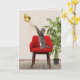 Gray tabby cat playing with gold foil balloon and ribbons on a red chair for 6th birthday.