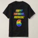 The front of this exciting, cheerful, and colourful birthday shirt design features a large number "6" and the message "HAPPY BIRTHDAY,", both having a rainbow spectrum gradient inspired pattern colouring, along with a bold yellow customisable name. Cheerful and bold birthday-themed shirts like this might be worn by the guests at somebody’s sixth birthday party and celebration. [~Z0000473]