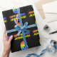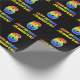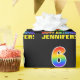 This cheerful, fun, and colourful birthday wrapping paper design features a large number "6" and the message "HAPPY BIRTHDAY,", both having a rainbow spectrum gradient inspired pattern colouring, along with a bold yellow customisable recipient name. The background is coloured black. Fun birthday themed wrapping paper like this could be used to wrap a gift or present being given to celebrate somebody’s sixth birthday. [~Z0000475]