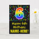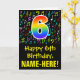 The front of this fun, colourful, and vibrant birthday themed greeting card design features a large number "6" with a rainbow spectrum gradient inspired pattern, along with the message "Happy 6th Birthday,", and an editable recipient name. The front also has a pattern of various music notes and symbols having a variety of colours and sizes. The inside features a personalised birthday greeting message, or could perhaps be cleared and left blank if a message is to be written by hand instead. A personalised birthday card like this might be a fun way to acknowledge somebody’s sixth birthday. [~Z0000420]