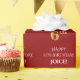 This luxurious and elegant birthday themed wrapping paper design has the message "HAPPY 6th BIRTHDAY,", a customisable name, and the birthday number "6th" having a faux/imitation gold inspired look pattern. The background is coloured red. Wrapping paper like this might be used when wrapping gifts to be given in celebration of somebody’s sixth birthday. [~Z0000491]