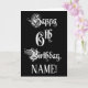 The front of this formal and lavish birthday greeting card design features the message “Happy 6th Birthday,” in elegant script style text, on a black coloured background. The inside has a customisable birthday greeting message, or could perhaps be cleared and left blank if a message is to be written by hand instead. An ornate, customisable birthday greeting card like this might be used to acknowledge somebody’s sixth birthday. [~Z0000554]