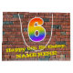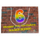 This vibrant and colourful birthday themed gift bag design, inspired by urban art and graffiti, features a large number "6" with a rainbow spectrum gradient inspired pattern, along with the message "Happy 6th Birthday,", and a personalised name. It also has a brick wall style pattern background. A gift-bag like this might be used when wrapping gifts being given to somebody in celebration of their sixth birthday. [~Z0000522]