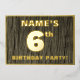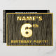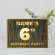 The front of this bold sixth birthday celebration foil invitation card features a customisable name, a large number “6th”, the message “BIRTHDAY PARTY!”, and a border, all in foil. The background of the front features a rustic, yet elegant, faux wood grain appearance inspired pattern. The back features personalised details about the event, such as the date, time, venue/location, and any other relevant information. Editable invitations like these might be used to invite attendees to a birthday party being held to honour somebody’s 6th birthday. [~Z0000598]