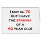 I may be 70 but I have the stamina of a 60 year old! Humourous design for the 70 year old who know he or she can compete with someone 10 years younger. Makes a great 70th birthday gift.