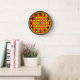 This wall clock has a 1970s design of solid yellow diamonds inside brown diamond outlines on a field of orange.