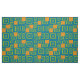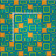 Fabric inspired from the 60s-70s with a orange background and stylistic blue cubes in different sizes and shapes.