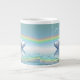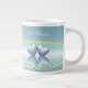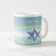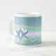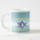 Giant coffee mug with my artwork of two platinum hearts floating on the water under a rainbow. Text says "70 Years".