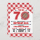 Celebrate the Big 7 O with this Birthday Barbecue Invitation with a red hot grill and gingham tablecloth pattern. Customise with your own text. Original Illustration by pj_design. Contact me for any help you need.