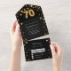 A black background, decorated with golden stars and a large number 70 in faux gold. Personalise and add a name, party details, RSVP date, return address and name.