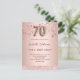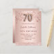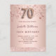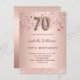 A modern, stylish and glamourous invitation for a 70th birthday party. A faux rose gold metallic looking background with rose gold and pink dripping stars and a glitter band. The name is written with a modern dark rose gold coloured hand lettered style script. Personalise and add your party details. Number 70 is written with a balloon style font, script.