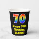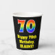 This fun and colourful birthday-themed paper cup design features a large number “70” having a rainbow spectrum gradient inspired pattern. It also features the message “Happy 70th Birthday,”, and a custom name. The background is coloured black. Colourful, vibrant paper cups like this might be fun to have at a birthday party being held in celebration of somebody’s 70th birthday. [~Z0000537]