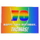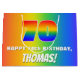 This fun and joyful birthday gift bag design features a large number “70” with a colourful rainbow spectrum inspired gradient pattern, along with the message “HAPPY 70th BIRTHDAY,”, and a customisable recipient name. The background also features a cheerful multicolored rainbow spectrum inspired gradient pattern. Birthday themed gift bags like this might be a fun way to wrap gifts or presents being given to somebody who is celebrating their seventieth birthday. [~Z0000577]